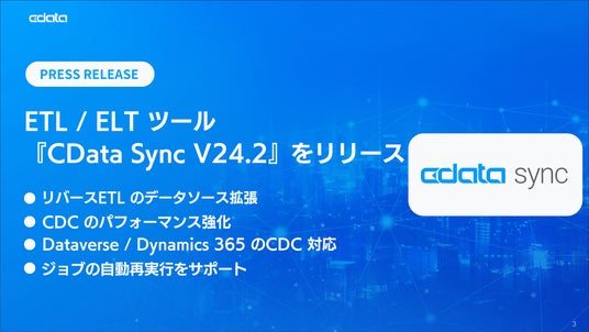 2024年8月6日、CData Software Japan 合同会社(本社:アメリカノースカロライナ州、日本オフィス:宮城県仙台市、代表社員 職務執行者:疋田 圭介、以下CData)は、400種類以上のSaaS・DB データをノーコードでETL / ELT 可能な『CData Sync』の新バージョン、V24.2をリリースしました。本リリースでは、PostgreSQL からSalesforce へのリバースETL を実現しました。また、変更データキャプチャ(CDC)初期利用時のパフォーマンス改善、Dataverse / Dynamics 365のCDC 対応、ジョブのリトライ機能などモダンデータパイプラインとしての付加価値を高める機能を追加しています。