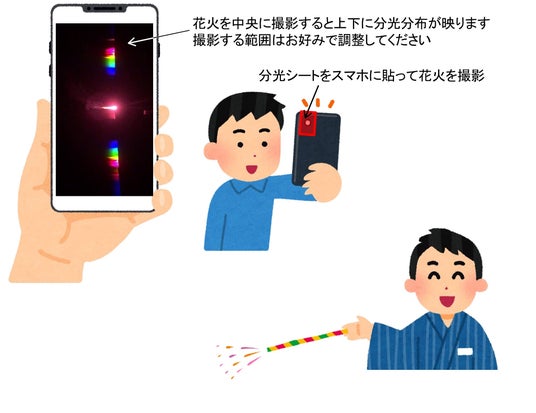 体験型の実験では、花火を燃やし、その様子を分光シート(=回折格子)を貼り付けたスマートフォンやタブレットで撮影します。炎色でどんな光がでているかを知ることができます。分光シートは、「花火の原理がわかる手持ち花火I 色火剤」に付属されています。