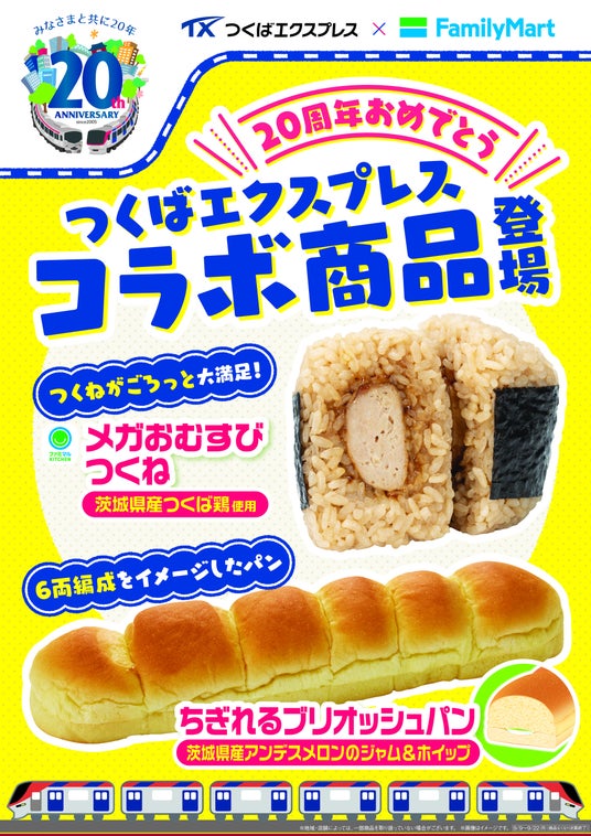 株式会社ファミリーマート(本社:東京都港区、代表取締役社長:細見研介)は、継続して取り組んでいる5つのキーワードの1つである「『あなた』のうれしい」の一環として、首都圏新都市鉄道株式会社(本社:東京都千代田区、代表取締役社長:松山一雄、以下首都圏新都市鉄道)が運営するつくばエクスプレス(以下、TX)の開業20周年を記念したコラボ商品「メガおむすびつくね つくば鶏使用」276円(税込298円)、「ちぎれるブリオッシュパン(茨城県産アンデスメロンのジャム&ホイップ)」147円(税込158円)の2種類を2025年9月9日(火)から関東地方の一部店舗にて発売いたします。