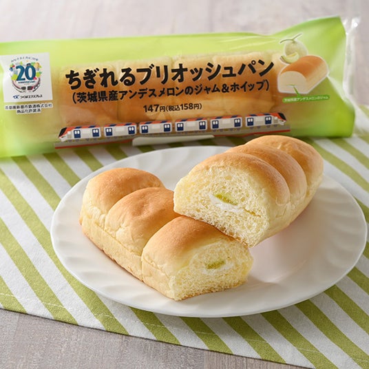 【内容】茨城県産アンデスメロンのジャムとホイップを、ふんわりとしたブリオッシュ生地で包み込みました。6両編成をイメージしたちぎれるタイプで、食べやすい仕様に仕上げました。