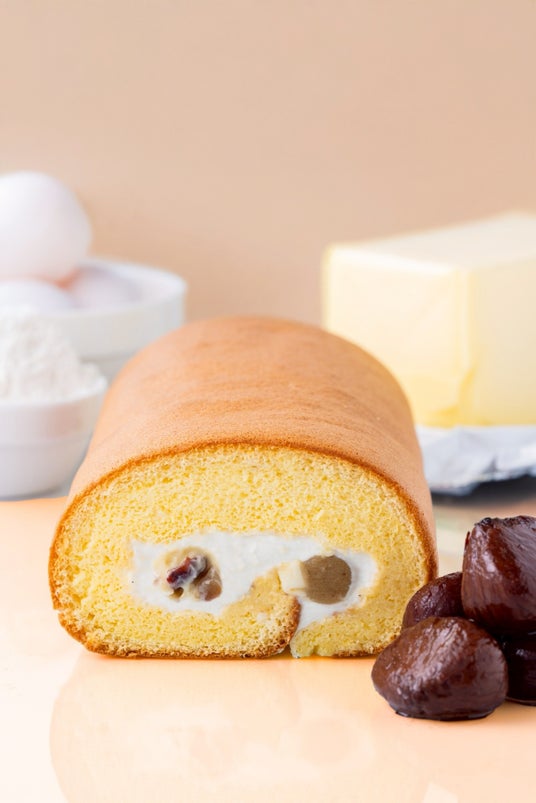 ふんわりしっとりとした優しい生地にふんわりホイップした生クリームを塗り、粗く刻んだ渋皮栗とカスタードを合わせたクリーム、茨城産の和栗をペースト状にしたクリームを絞り、塩味を効かせたバターをそっと忍ばせ巻き上げました。