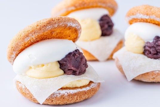 パティスリーであるプルーストならではのカスタードクリームや生クリーム、求肥や粒あんを入れ、大福のような味わいをパフケーキでサンドしました。