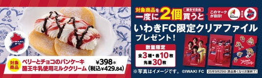 いわきFCをイメージした限定パッケージで発売。福島県の定番である酪王牛乳を贅沢に使用したパンケーキ。クリームは牛乳本来の甘さと濃厚な味わいが特長で、ベリーソースとチョコが良いアクセントになっています。