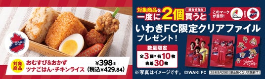 いわきFCをイメージした限定パッケージで発売。おにぎりにはいわきに馴染みのあるツナごはんと、チームカラーのキングレッドをイメージしたチキンライスを組み合わせました。2種類のおむすびに相性の良いおかずを組み合わせた満足感のある商品です。