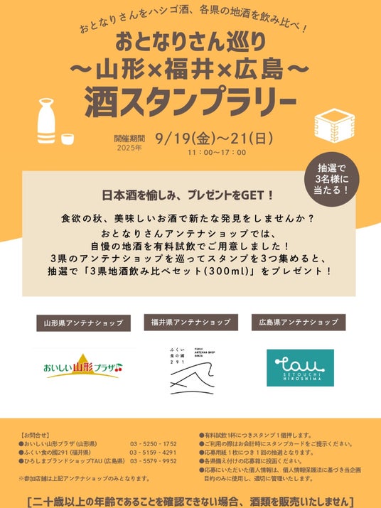 おとなりさん巡り~山形×福井×広島~酒スタンプラリーを開催いたします。
