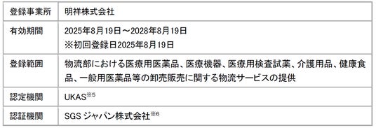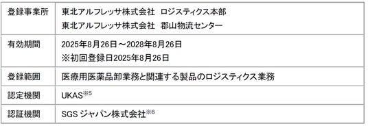 当社の子会社で医療用医薬品等卸売事業を行う明祥株式会社(本社:石川県金沢市、代表取締役 社長執行役員:川尻洋光、以下「明祥」といいます)の管理本部物流部※1ならびに東北アルフレッサ株式会社(本社:宮城県仙台市・福島県郡山市、代表取締役社長:内田信也、以下「東北アルフレッサ」といいます)のロジスティクス本部および郡山物流センターが、品質マネジメントシステムに関する国際規格「ISO9001」の認証を取得いたしましたので、下記のとおりお知らせいたします。