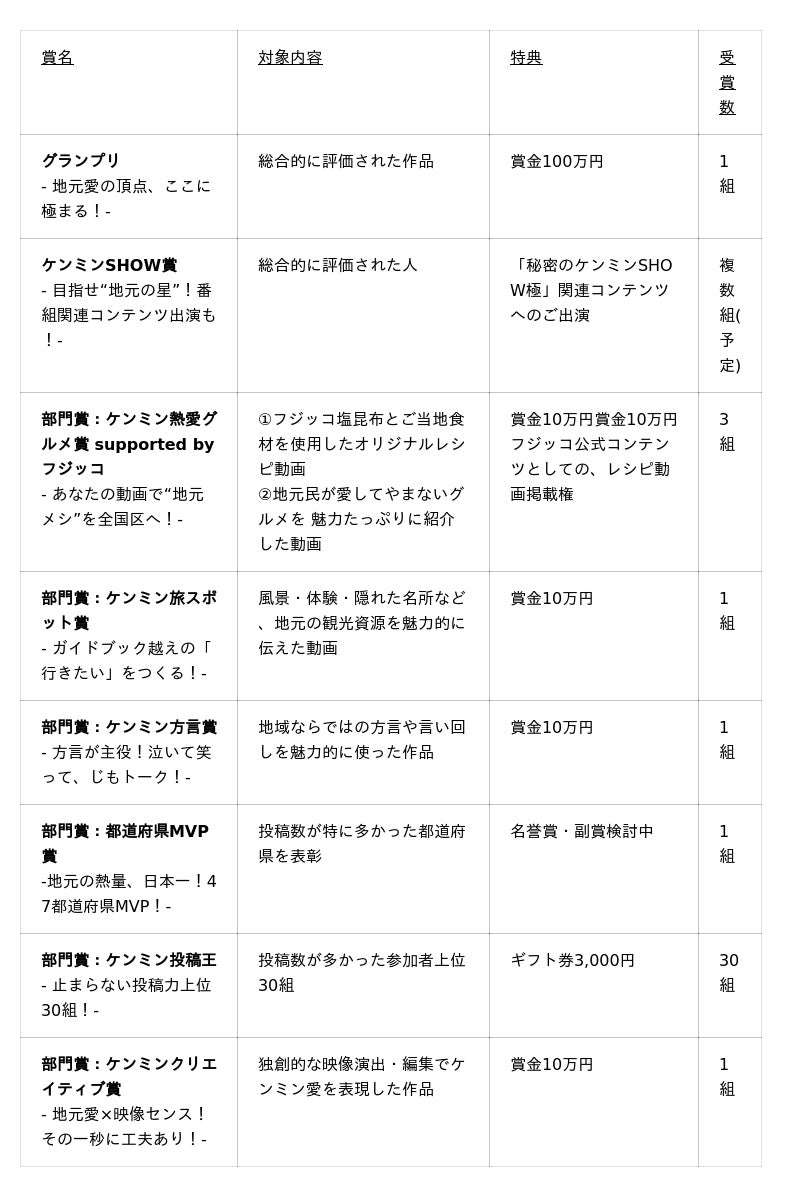 より多様な“ケンミン愛”の表現を讃えるため、個性豊かな【部門賞】を発表します。ショート動画を通じて発信された「食」「場所」「言葉」など、各地域ならではの魅力が光る投稿を多角的な視点で評価・表彰していきます。今回新たに発表する部門賞は『ケンミン熱愛グルメ賞』 『ケンミン旅スポット賞』 『ケンミン方言賞』 『都道府県MVP賞』 『ケンミン投稿王』 『ケンミンクリエイティブ賞』の6部門です。それぞれの賞には賞金や副賞が用意されており、地域の魅力発信を後押しする仕掛けが盛り込まれています。あなたの“ケンミン愛”が、日本をもっと元気にします。たくさんのご投稿、お待ちしています! ※各賞の対象内容・特典・受賞数は「応募要項」に明記