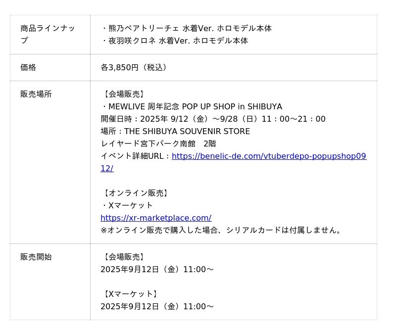 株式会社Gugenka(代表取締役CEO 三上昌史)は、2025年9月12日(金)よりTHE SHIBUYA SOUVENIR STOREレイヤード宮下パーク南館 2階で開催する『MEWLIVE 周年記念 POP UP SHOP in SHIBUYA』にて、MEWLIVE所属ライバー『熊乃ベアトリーチェ』『夜羽咲クロネ』のデジタルフィギュアサービス「ホロモデル」水着衣装商品の販売を開始いたしました。