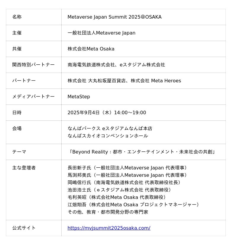 デジタル空間やeスポーツを活用して地域課題を解決する株式会社Meta Osaka(所在地:大阪府大阪市、代表取締役:毛利英昭、以下Meta Osaka)は、一般社団法人Metaverse Japan(代表理事:長田新子、馬渕邦美、以下MVJ)と共催で、2025年9月4日、なんばパークス eスタジアムなんば本店にて「Metaverse Japan Summit 2025@OSAKA」を開催しました。メタバース技術を活用した都市づくりやエンターテインメントの未来について、産官学のトップランナーが一堂に会し、「Beyond Reality:都市・エンターテインメント・未来社会の共創」をテーマに、メタバース社会の実装に向けた具体的なロードマップが議論されました。会場には約500名が来場し、関西におけるデジタル技術への高い関心を改めて示す結果となりました。