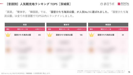 業界最大級のインバウンドビジネスメディア「訪日ラボ」及び 店舗向け集客一元化プラットフォーム「口コミコム」を運営する株式会社mov(代表取締役:渡邊 誠、本社:東京都渋谷区、以下mov)は、茨城県の観光地に寄せられた最新の口コミデータから、独自の『インバウンド人気観光地ランキング』を発表しました。