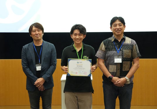 プログラム全体統括 東京大学 五十嵐圭日子 教授(右)、一般財団法人トヨタ・モビリティ基金 石川貴規 事務局長(左)と採択者(中央)