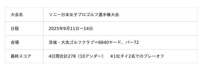 金澤選手は2017年7月にプロテストに合格。ツアー参戦9年目となる2025年シーズンはこれまで2位タイ、3位タイにそれぞれ2回食い込むなど、初優勝まであと一歩に迫り、今回、地元茨城で開催された国内メジャー大会で、見事に大願成就いたしました。
