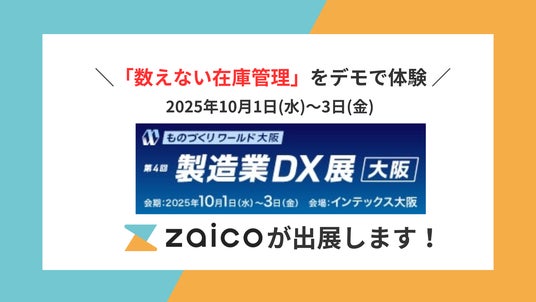 クラウド在庫管理システム「zaico」を開発・提供する株式会社ZAICO(本社:山形県米沢市、代表取締役:田村 壽英、以下「当社」)は、2025年10月1日から3日間にわたり開催される大型展示会「ものづくりワールド[大阪]」内の「第4回製造業DX展[大阪]」に出展することをお知らせいたします。