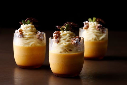 今秋収穫されたばかりの笠間産新栗のプリンとフルーツを組み合わせた、クラシカルなスタイルのプリン ア・ラ・モードをパフェスタイルでお楽しみいただきます。新栗はラム酒をしのばせたプリンに仕立ててご提供するほか、新栗ならではの素材の風味をご堪能いただけるように、裏ごししたそぼろを盛り付けました。フルーツは、フレッシュな巨峰、マスカット、メロンなどのほか、コンポートした洋梨、青りんごゼリー、洋梨のソースなど、さまざまな味覚をお楽しみいただけます。
