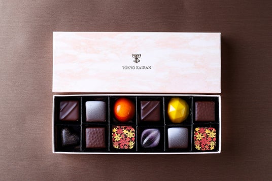<内容>1.ガナッシュ ノワール:ハイカカオのチョコレートを使用、東京會舘定番の一品/2.ほうじ茶:ほうじ茶の香ばしい香りが広がるガナッシュ/3.キャラメルブールサレ:リッチな塩バターキャラメルボンボン、東京會舘定番の一品/4.キャラメルポワール:洋梨のパート・ド・フリュイとキャラメルの二層仕立て/5.プラリネ:アーモンドとヘーゼルナッツのプラリネ、東京會舘定番の一品/6. 紅茶とブラウンカルダモンのガナッシュ:紅茶とスモーキーなカルダモンが香るミルクチョコレートをハイカカオでコーティングしたハート形/7.ピーカンナッツとメープルシュガーのプラリネ:深みのある香ばしさのピーカンナッツ入り、紅葉の絵柄/8.ラムレーズン:自家製ラムレーズンが入ったダークラムが香るガナッシュ