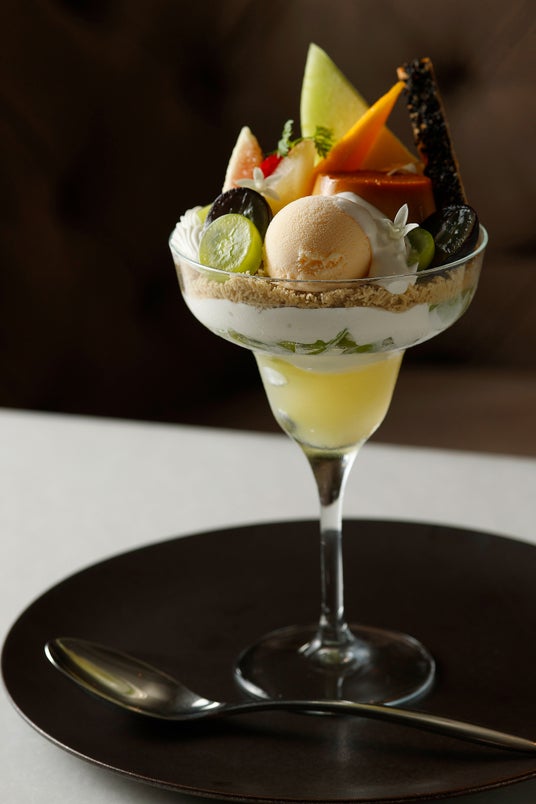 笠間産新栗のプリン、笠間産新栗のそぼろ、バニラアイスクリーム、フルーツ(メロン、巨峰、マスカット、いちじく、洋梨のコンポート、マンゴー、フランボワーズ)、青りんごゼリー、洋梨のソース、ほうじ茶のクッキー、セサミパイ、生クリーム
