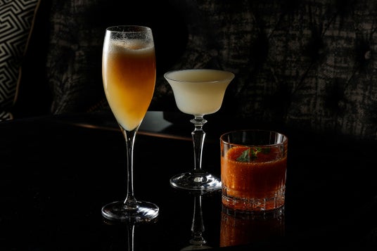 11月:柿のバラライカ(右)¥2,530 旬の果実をふんだんに使った月替わりのカクテルです。9月は桃から作る果汁に辛口のスパークリングワインを加えた上品な甘さが楽しめるカクテル、10月は梨の果汁に、山椒や柚子などで風味づけした京都産ドライジン「季の美(きのび)」を加えたカクテル、11月は柿の果汁に、桜の葉のようなフレーバーが特長のズブロッカを組み合わせた一杯をお届けします。
