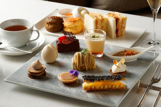 笠間産新栗のプリン/笠間産新栗のモンブラン 青りんごのムースと一緒に/塩キャラメルとフランスマロンのタルト/マロングラッセ入りフィナンシェ/マカロン 笠間産新栗とマンダリンオレンジ/アールグレイ香るどらやき マロングラッセクリーム/セサミパイのミルフィーユ マロンカスタード/栗のガレット フロマージュブラン/栗のブルテ/海老と白身のサンドウィッチ/スコーン2種 (プレーン・ほうじ茶)/フルーツジャム/クロテッドクリーム