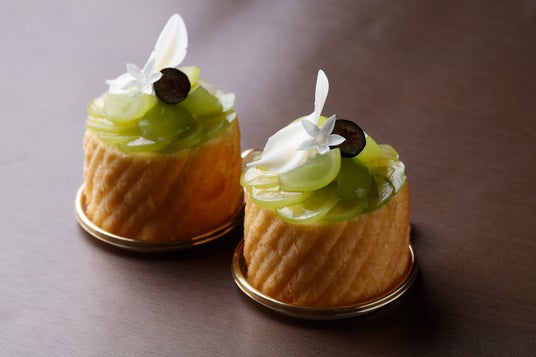 卵の風味豊かなビスキュイ生地に、旬のシャインマスカットを飾り付けて秋らしくアレンジしました。中央に入った青りんごのゼリー入りバニラムースはまろやかな風味で、柔らかなビスキュイとともに、ふんわり口どけのよい味覚が広がります。