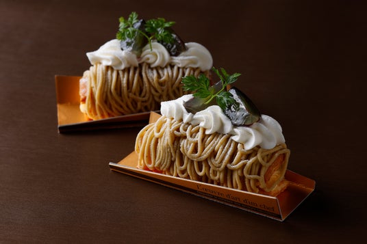 笠間産の新栗をそぼろにしてほうじ茶フレーバーの生クリームと組み合わせ、ほうじ茶のスポンジと二段重ねにしました。トップには新栗で作ったペーストとチョコレートを飾り付けてご提供します。