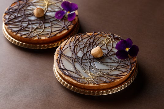 マロングラッセの入ったフィナンシェと、キャラメリーゼしたアーモンドを味わっていただくタルトです。甘味を引き立たせるため塩を加えた生キャラメルを重ね、網目状に細工し金粉で彩ったビターチョコレートとヘーゼルナッツを飾り付けました。