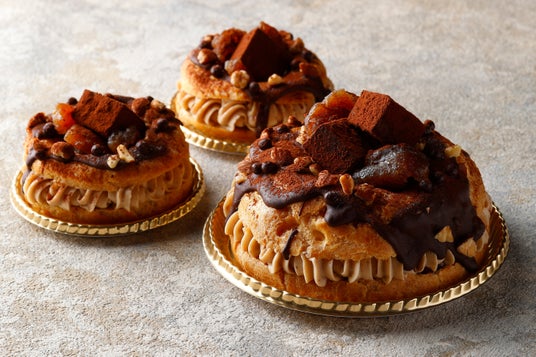 軽い食感が楽しめるシュー生地のスイーツ。チョコレートカスタードクリームと、スペイン産のマロングラッセやマロンソースが入った生クリームをサンドし、とろける食感の生チョコレートやチョコレートソース、アーモンドを飾り付け、S/Lの2サイズでご提供します。