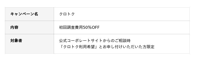 また、現在、公式サイト限定で初回調査費用が50%OFFとなる『クロトクキャンペーン』を実施しています。