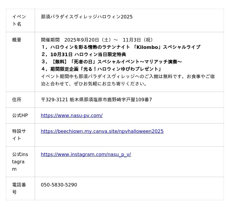 9月20日~11月3日の期間中、那須パラダイスヴィレッジが「本気のハロウィン」で染まります。リアルで不気味なゾンビやモンスターたちが施設内を埋め尽くす、 怖いけど 目が離せない本格的なハロウィンを体験できます。期間中は特別なイベントもご用意しています。「カワイイ」ハロウィンでは物足りない方 この秋は那須パラダイスヴィレッジへお越しください。