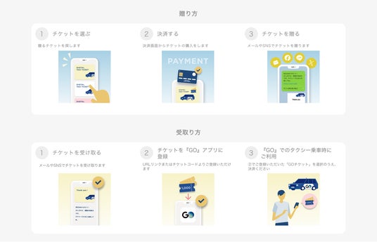 - ご利用方法:購入・贈呈いただいた「GOチケット」は、タクシーアプリ『GO』をご利用の際、支払い方法を「GOチケット」に設定いただくとお支払いに使えます。