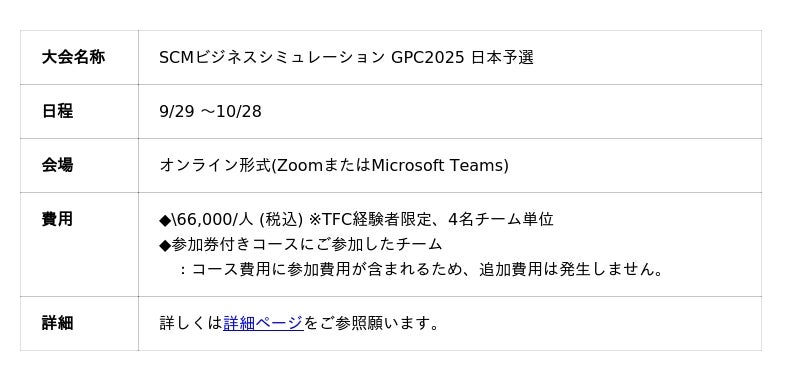 日本予選に参加するには、あらかじめSCM基礎コースやSCMビジネスシミュレーション研修を受講いただく必要があります。