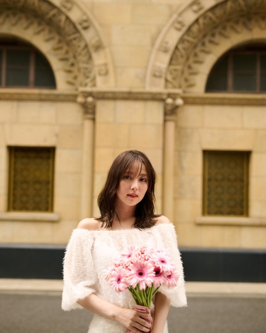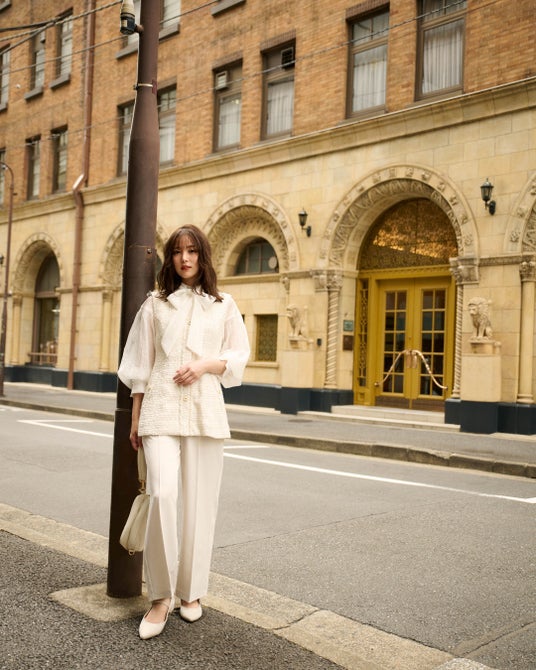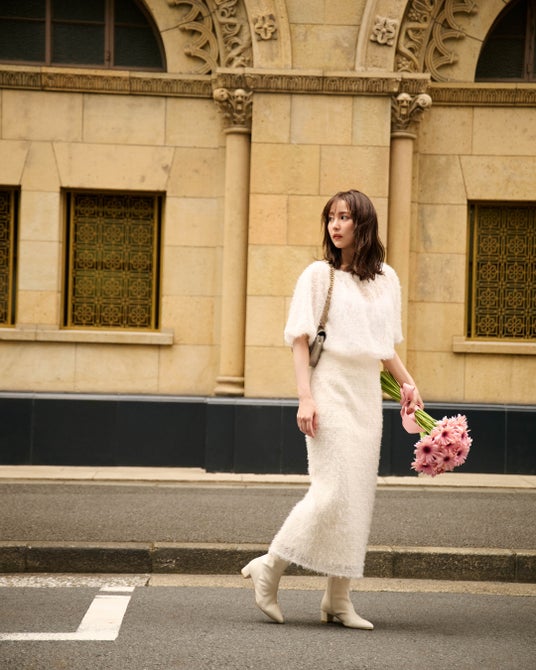 4.フワッと柔らかな素材&上品ホワイトのセットアップは、纏うだけでエレガント