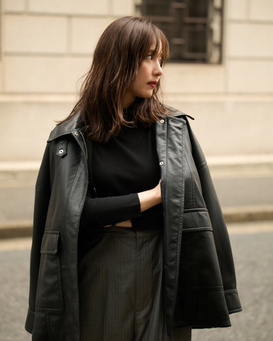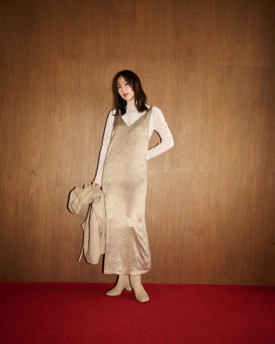 10.品のあるベージュのワントーンコーデはレザーやサテンの光沢感でキャッチーに