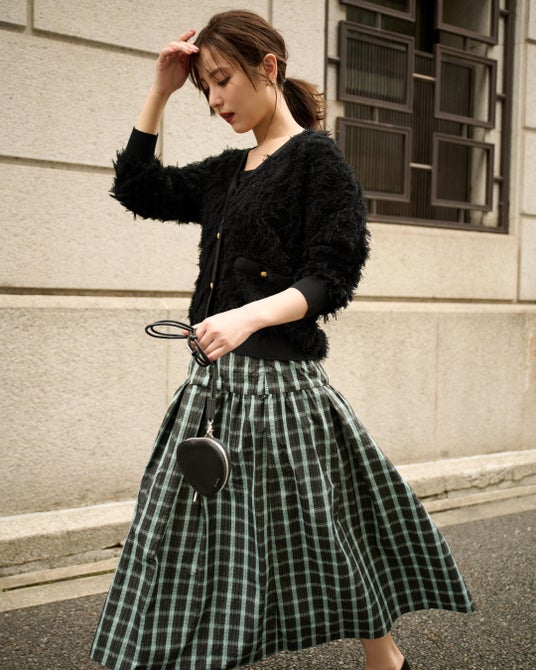 3.歩くたびに華やかな存在感を放つ大人好みのシックなチェックスカート