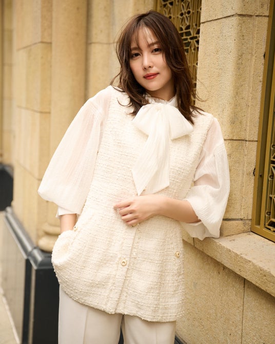 1.ピュアなムードのホワイトコーデは秋らしさを誘うツイードジレを主役に