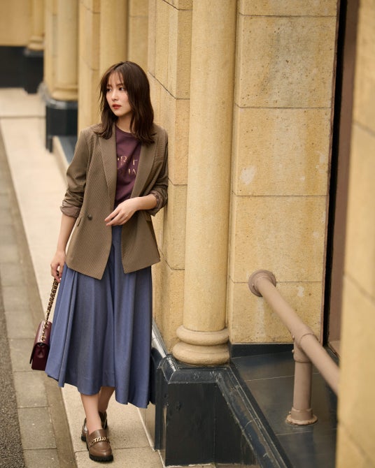 JACKET / ¥29,700、T-SHIRT / ¥8,250、SKIRT / ¥17,600、BAG / ¥14,300、LOAFERS / ¥18,700