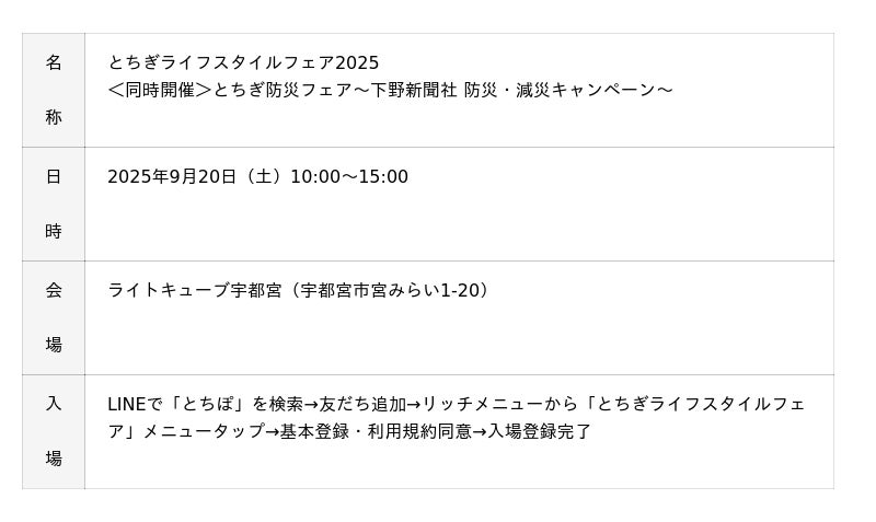 東日印刷株式会社(本社:東京都江東区、社長:西川 光昭、以下TONICHI)は、9月20日(土)にライトキューブ宇都宮で開催される「とちぎライフスタイルフェア2025」および同時開催の「とちぎ防災フェア~下野新聞社 防災・減災キャンペーン」に、栃木ダイレクトコミュニケーションズ株式会社(本社:栃木県宇都宮市、社長:綱川 仁士、以下 栃木DC)と共同で出展いたします。