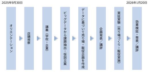 近年、消費者の購買行動は多様化し、小売業では勘や経験だけではなくデータに基づいた施策立案や売場づくりが求められています。このプログラムでは、学校での授業に加え、連携企業によるデータ分析や売り場作り・販促に関する講義を実施します。グループワークや店舗視察を行った後、売り場をプランニングし、実際に店舗で展開します。立案から効果検証までを経験することで、社会で役立つ実践的なスキルが身に付きます。【プログラムの流れ】