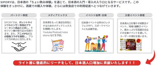 今後は「SIPORYで初めて日本酒に触れた」という方が次のステップへ進めるよう、ライト層でも楽しめる飲みやすい銘柄や体験型イベントを積極的に展開予定です。サブスクでの“ちょい飲み体験”から、リアルイベントでの“推し酒との出会い”、さらに地域連携イベントでの“旅と日本酒の融合”へ。オンラインとオフラインを横断しながら、日本酒に不慣れな方から熱心な愛好家まで楽しめるコミュニティを築いていきます。