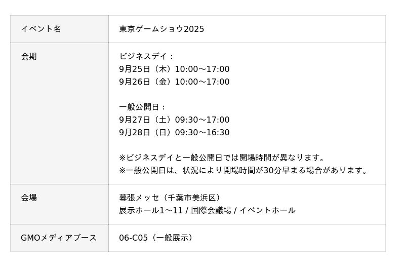 GMOメディアは「東京ゲームショウ2025」へ出展いたします。ブースでは「プレイボックス byGMO」の魅力を体験できるコーナーを設置するほか、来場者の皆さまにお楽しみいただける企画をご用意しています。