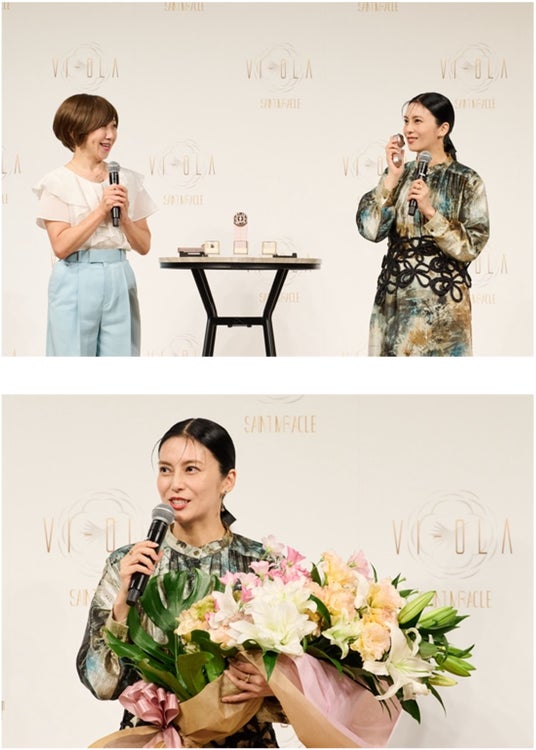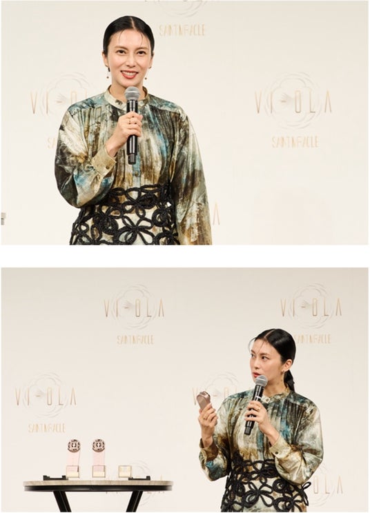 今回の発表を記念して、ブランドアンバサダーの柴咲コウさんが登壇しました。華やかな衣装を身に纏った柴咲さんは、ポイントを聞かれると「肌のハリ感やツヤ感を表現できればと思い、質感のあるものを選びました。」と話しました。2024年の4月にVI-OLAのアンバサダーに就任した柴咲さんですが