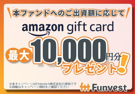 本ファンドへ出資していただいた投資家の皆様を対象として、出資額に応じて最大10,000円分のAmazonギフトカードをプレゼントするキャンペーンも併せて実施いたします。