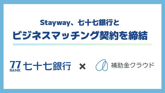 補助金クラウドを運営する株式会社Stayway(本社:大阪府大阪市、代表取締役:佐藤 淳、以下「Stayway」)は、株式会社七十七銀行(本店:宮城県仙台市、取締役頭取:小林 英文、以下「七十七銀行」)とビジネスマッチング契約を締結いたします。本提携は、補助金クラウドを通じて補助金活用における専門的な知識と効率的な申請支援を提供することを目的としており、七十七銀行の地域企業に対する補助金申請支援を一層強化し、地域経済の活性化に寄与する重要な一歩となります。