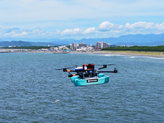 水難現場において、浮環の自動投下や音声誘導を可能にする高性能レスキュードローン。
