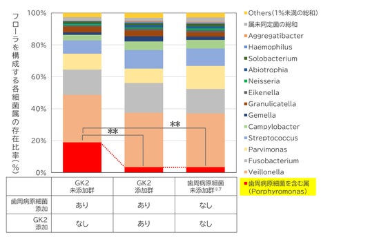 歯周病原細菌に対する抑制作用を有する成分を探索したところ、GK2が歯周病原細菌の増殖を抑制することを見出しました。さらに、(1)で構築した評価系を用いて検討した結果、GK2を添加することでフローラを構成する歯周病原細菌の存在比率が有意に低下し、歯周病原細菌を添加していないフローラ(※7)の菌バランスに近づく傾向を確認しました(図2)。