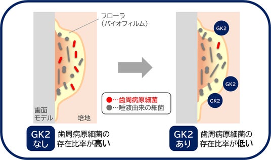 以上の結果から、GK2は、フローラを構成する歯周病原細菌の存在比率を低下させ、歯周病原細菌を添加していないフローラの細菌構成に近づける作用を有することが明らかになりました。このことから、歯周病原細菌が引き起こす口内フローラの乱れがGK2によって抑制され、結果として歯周病に繋がる炎症の抑制に貢献することが期待されます。
