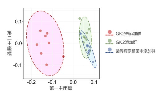 また、フローラ全体の細菌構成の違いを把握するため、主座標分析(※8)を行ったところ、GK2未添加の系よりも、GK2を添加した系で、歯周病原細菌未添加の系に近づくことが示されました(図3)。この結果は、GK2がフローラを構成する歯周病原細菌を抑制し、口内フローラのバランスを整える作用を有することを示唆しています。