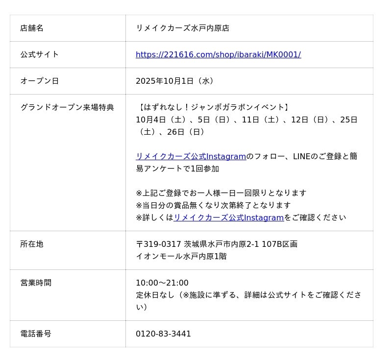 リメイクカーズ水戸内原店(茨城・水戸市):2025年10月1日(水)