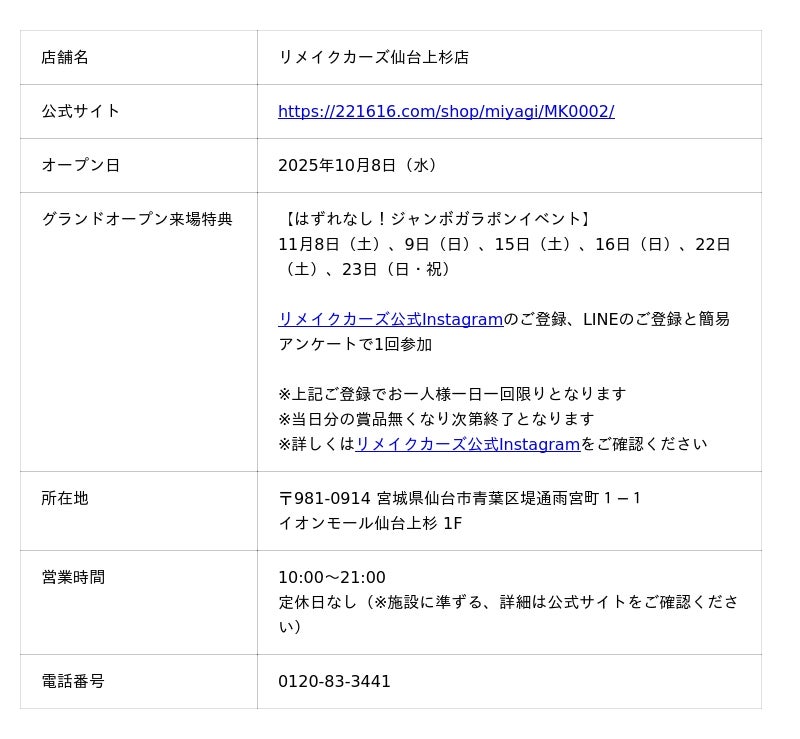 リメイクカーズ仙台上杉店(宮城・仙台市):2025年10月8日(水)