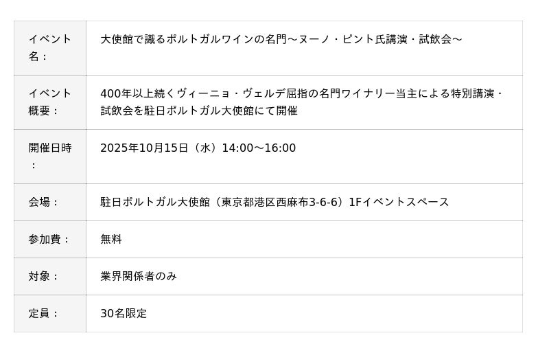 今屋株式会社は、2025年10月15日(水)に駐日ポルトガル大使館にて、ヴィーニョ・ヴェルデ屈指の名門ワイナリー「キンタ・ド・モンティーニョ(Quinta do Montinho)」の当主、ヌーノ・ピント(Nuno Pinto)氏を招待して特別講演・試飲会を開催いたします。
