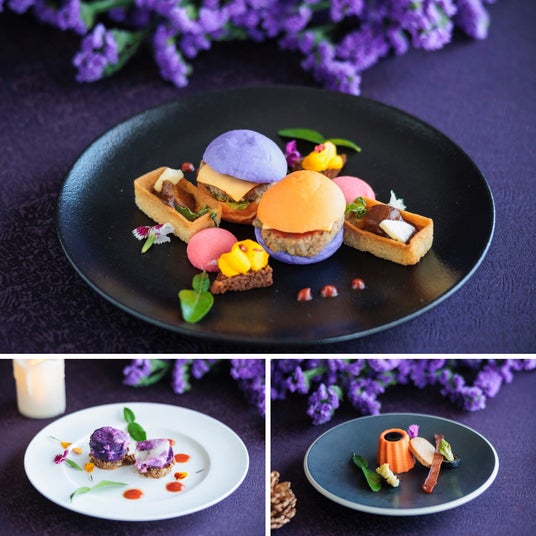 (写真左下:チョイスの温製(紫芋グラタン)、同右下:チョイスの冷製(パプリカヴァヴァロワ))